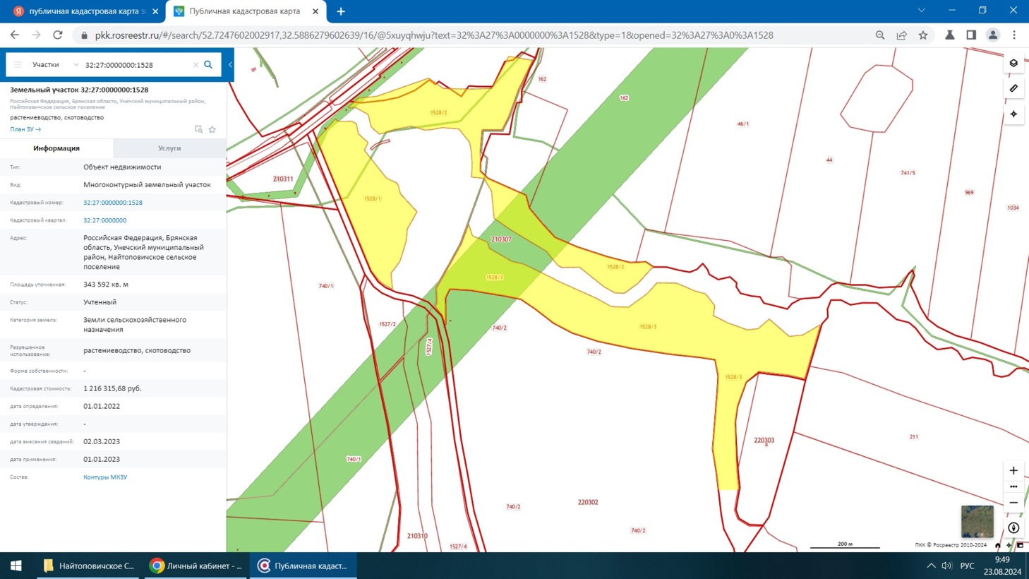 Земельный участок сельскохозяйственного назначения с кадастровым номером 32:27:0000000:1528, площадью 343 592м2, с разрешенным использованием: растениеводство, скотоводство, местоположение: Российская Федерация, Брянская область, Унечский муниципальный район, Найтоповичское сельское поселение.