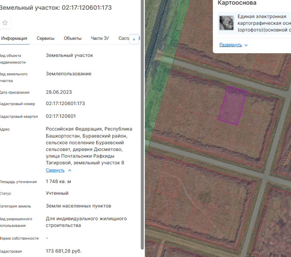 Максимально допустимые параметры разрешенного строительства объекта капитального строительства (при необходимости): -; Минимально допустимые параметры разрешенного строительства объекта капитального строительства (при необходимости): -; Возможность подключения (технологического присоединения) объектов капитального строительства к сетям инженерно-технического обеспечения (за исключением сетей электроснабжения): Технические условия подключения (технологического присоединения) к сетям инженерно-технического обеспечения содержатся в приложенном файле "Извещение об электронном аукционе"; Месторасположение: Респ Башкортостан, м.р-н Бураевский, с.п. Бураевский сельсовет, д Дюсметово, ул. Почтальона Рафхиды Тагировой земельный участок 8; Кадастровый номер: 02:17:120601:173; Форма собственности: 97; Характеристики имущества: Основной вид разрешенного использования: Жилая застройка, Для индивидуального жилищного строительства, Регистрационный номер ЕГРОКН: -, Территориальные зоны: Жилая