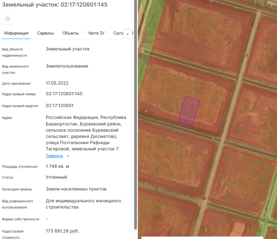 Максимально допустимые параметры разрешенного строительства объекта капитального строительства (при необходимости): -; Минимально допустимые параметры разрешенного строительства объекта капитального строительства (при необходимости): -; Возможность подключения (технологического присоединения) объектов капитального строительства к сетям инженерно-технического обеспечения (за исключением сетей электроснабжения): Технические условия подключения (технологического присоединения) к сетям инженерно-технического обеспечения содержатся в приложенном файле "Извещение об электронном аукционе"; Месторасположение: Респ Башкортостан, м.р-н Бураевский, с.п. Бураевский сельсовет, д Дюсметово, ул. Почтальона Рафхиды Тагировой земельный участок 7; Кадастровый номер: 02:17:120601:145; Форма собственности: 97; Характеристики имущества: Основной вид разрешенного использования: Жилая застройка, Для индивидуального жилищного строительства, Регистрационный номер ЕГРОКН: -, Территориальные зоны: Жилая