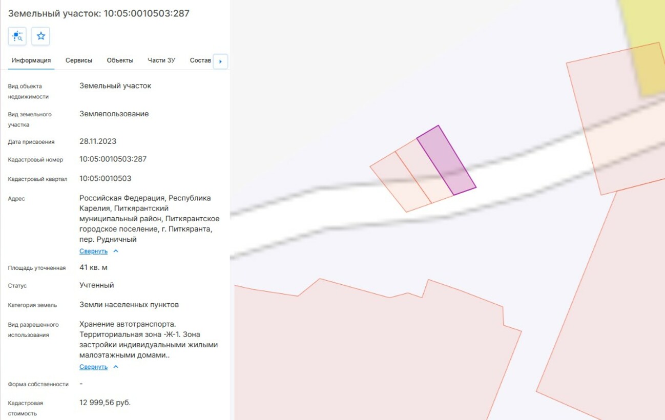 Максимально допустимые параметры разрешенного строительства объекта капитального строительства (при необходимости): содержится в градостроительном плане земельного участка (в прилагаемой документации).; Минимально допустимые параметры разрешенного строительства объекта капитального строительства (при необходимости): содержится в градостроительном плане земельного участка (в прилагаемой документации).; Возможность подключения (технологического присоединения) объектов капитального строительства к сетям инженерно-технического обеспечения (за исключением сетей электроснабжения): содержится в градостроительном плане земельного участка (в прилагаемой документации).; Месторасположение: респ. Карелия, м.о. Питкярантский, г. Питкяранта; Кадастровый номер: 10:05:0010503:287; Форма собственности: 97; Характеристики имущества: Основной вид разрешенного использования: Хранение автотранспорта, Территориальные зоны: Жилая