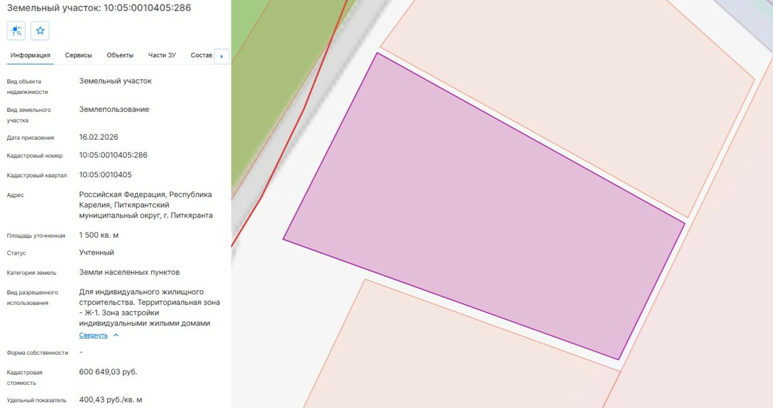 Максимально допустимые параметры разрешенного строительства объекта капитального строительства (при необходимости): содержится в градостроительном плане земельного участка (в прилагаемой документации).; Минимально допустимые параметры разрешенного строительства объекта капитального строительства (при необходимости): содержится в градостроительном плане земельного участка (в прилагаемой документации).; Возможность подключения (технологического присоединения) объектов капитального строительства к сетям инженерно-технического обеспечения (за исключением сетей электроснабжения): содержится в градостроительном плане земельного участка (в прилагаемой документации).; Месторасположение: респ. Карелия, м.о. Питкярантский, г. Питкяранта; Кадастровый номер: 10:05:0010405:286; Форма собственности: 97; Характеристики имущества: Основной вид разрешенного использования: Для индивидуального жилищного строительства, Территориальные зоны: Жилая