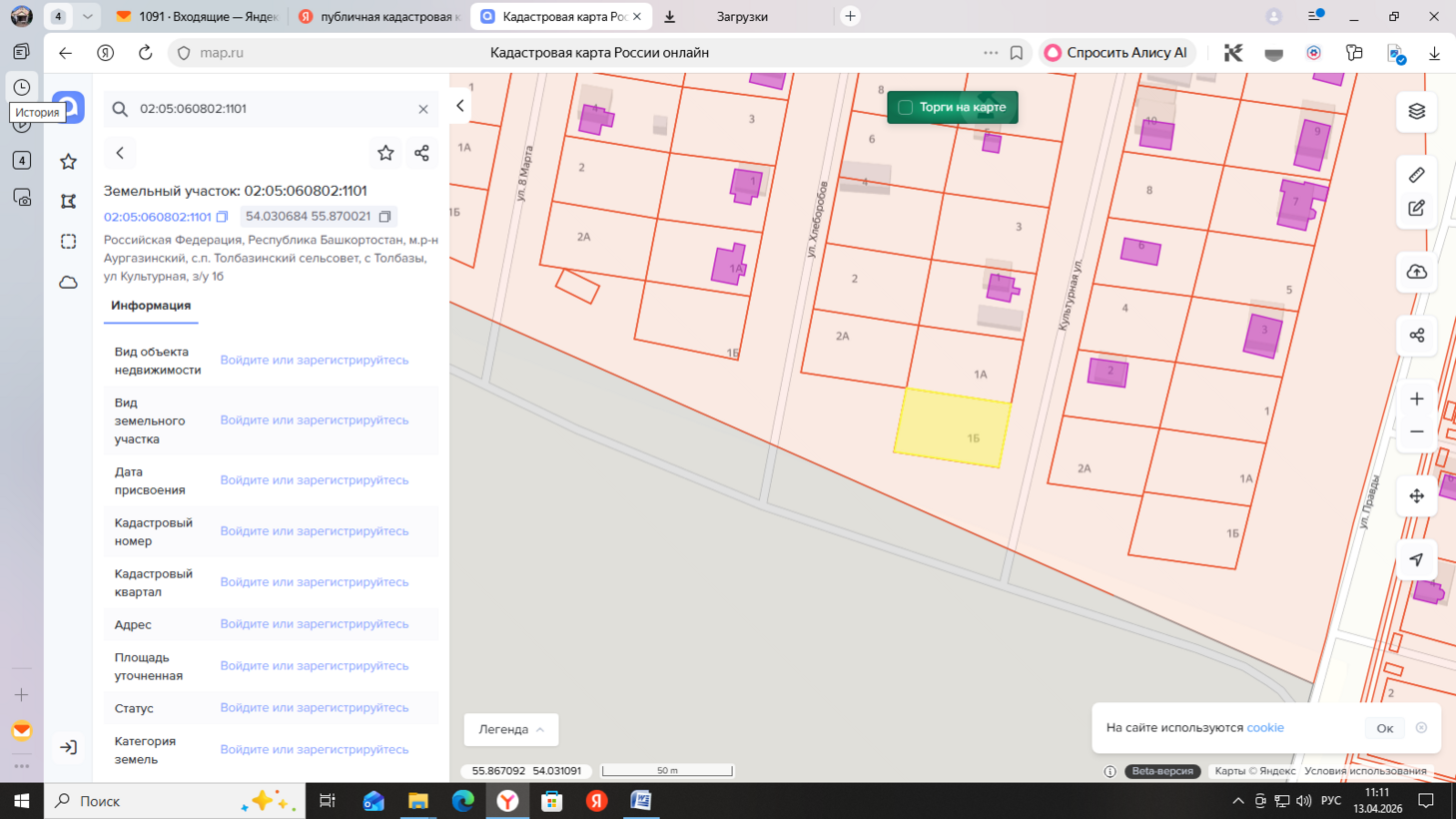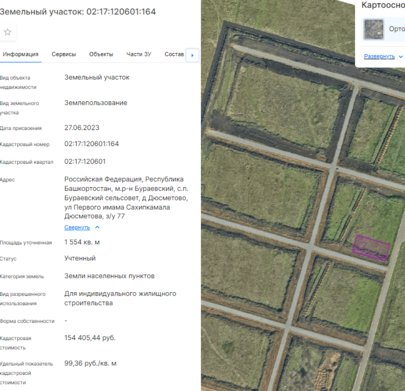 Земельный участок с кадастровым номером 02:11:020404:506, категория земель – земли населенных пунктов, площадью 1154 кв. м, местоположение: Российская Федерация, Республика Башкортостан, м.р-н Белорецкий, с.п. Инзерский сельсовет, с Инзер, ул Пушкина, з/у 24а, вид разрешенного использования – для индивидуального жилищного строительства.
