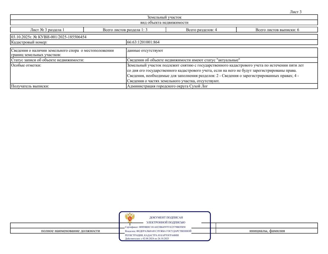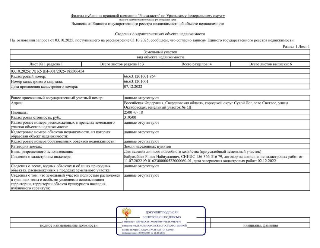 Лот № 3 – продажа земельного участка с кадастровым номером 66:63:1201001:864, расположенного по адресу: Российская Федерация, Свердловская область, городской округ Сухой Лог, село Светлое, улица Октябрьская, земельный участок № 5Д (категория земель – земли населенных пунктов), с разрешенным использованием – для ведения личного подсобного хозяйства (приусадебный земельный участок), общей площадью 2 500,0 кв.м.