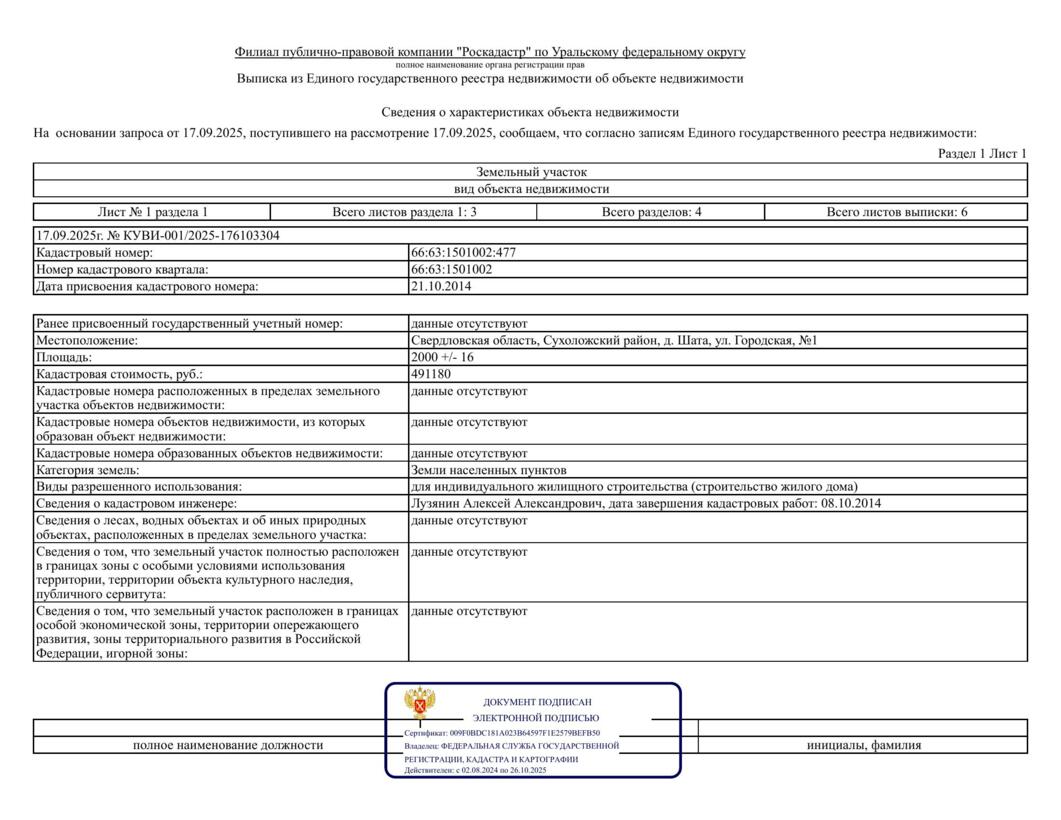 Максимально допустимые параметры разрешенного строительства объекта капитального строительства (при необходимости): см. приложение № 3 к настоящему Извещению; Минимально допустимые параметры разрешенного строительства объекта капитального строительства (при необходимости): см. приложение № 3 к настоящему Извещению; Возможность подключения (технологического присоединения) объектов капитального строительства к сетям инженерно-технического обеспечения (за исключением сетей электроснабжения): Подключить объект к централизованным сетям канализации и водоснабжении нет технической возможности, ввиду отсутствия сетей в данном районе. Теплоснабжение: В данном районе котельные и тепловые сети отсутствуют. Газоснабжение: Возможность подключения (технологического присоединения) к действующим сетям газораспределения имеется. Обустройство подъездных путей к земельному участку отсутствует.; Месторасположение: обл Свердловская, м.о. Сухой Лог, д Шата, ул Городская Свердловская область, Сухоложский район, д. Шата, ул. Городская, № 1; Кадастровый номер: 66:63:1501002:477; Форма собственности: 97; Характеристики имущества: Вид разрешённого использования земельного участка: Для индивидуального жилищного строительства